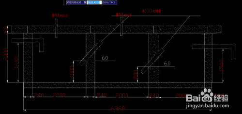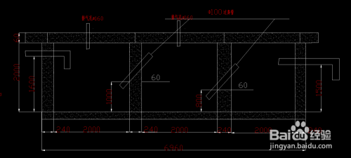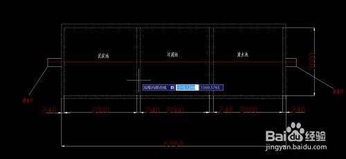 点击画图东西栏中的“矩形”或“直线”按钮,点击“ 正交 ”按钮,绘制三级池的剖面以及管道、排气孔,并进行标注。