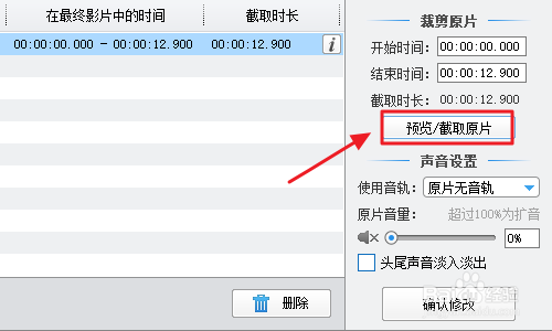 接下来,在软件的中心位置找到“预览/截取原片”选项,然后在截取功能里我们手动定位截取的起止时候...