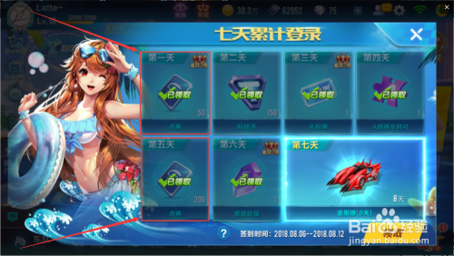 每周签到奖励里面能获得点券,一周下来能获得200+50=250点券摆布。如图所示。