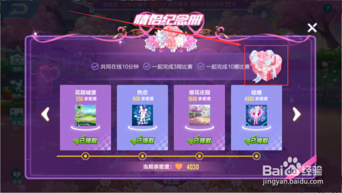 天天和情侣跑几局就可以完当作使命啦,在情侣纪念册里面点击爱心盒子就能获得100点券。天天都可以做。到了情侣月纪念日,同时在线系统会送1314点券。所以一周大要可以获得100*7+1314/7=887点券。