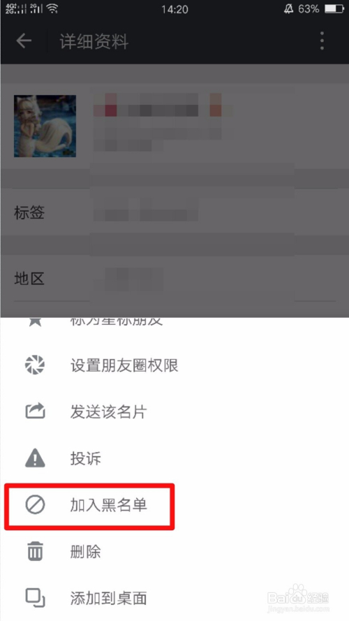 然后在弹出的新窗口点击一下【插手黑名单】的选项。