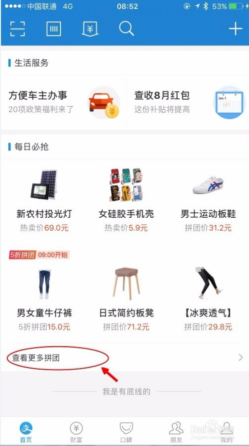 登岸付出宝之后,滑到首页最底下,可以看到拼购