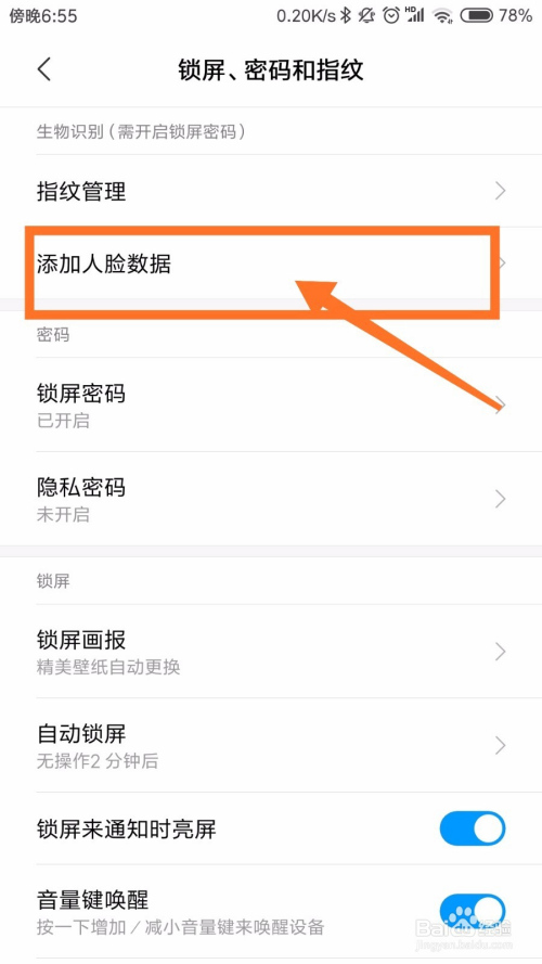 点击进入锁屏密码,指纹解锁选项之后,我们点击添加人脸数据,如下图所示。