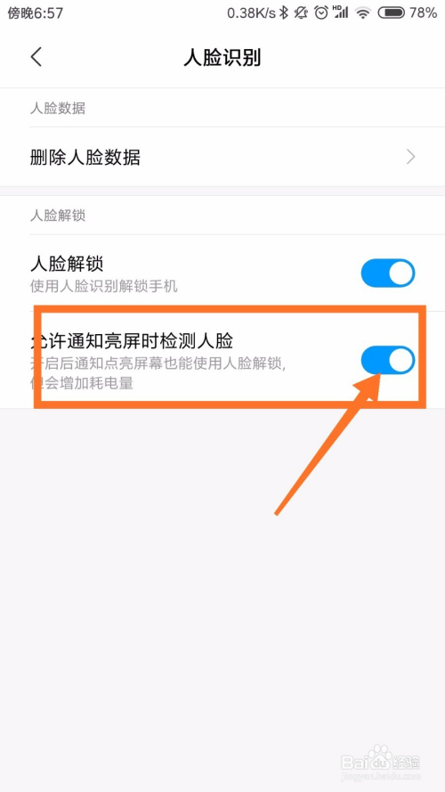 录入完当作之后,人脸解锁就打开了。然后我们可以交通知亮屏时的选项也打开,如下图所示