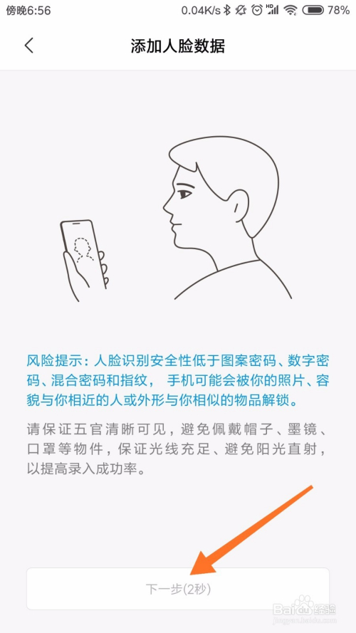 点击添加人脸数据之后系统会提醒你,人脸指纹解锁的平安性比力低,我们不消管,继续点击下一步即可,如下图所示。