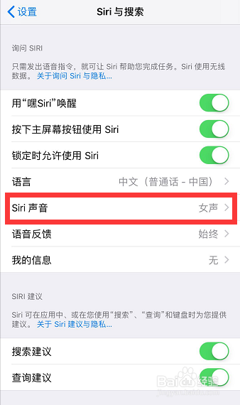 在Siri与搜刮界面下,找到【Siri声音】这项(看右侧可看出,此时Siri声音默认为女生),点进去。