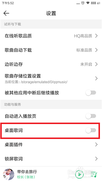 设置好后打开QQ音乐,在设置功能中找到【桌面歌词】并把后方的选项给打开。