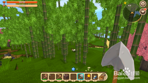 东西建造完毕出发寻找竹林。如下图所示,竹林的地面上处处都有竹笋,有东西打坏后再捡起,背包里就会有竹笋了,这是第一种方式也是最常见的方式。