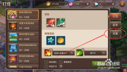 接着,我们在魔力宝物的打怪页面的右上方处找到“采集 ”按钮,点击打开魔力宝物采集选择页面 。