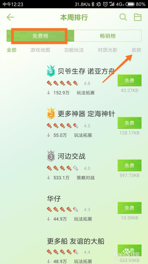 进入排行页面之后,我们可以看到游戏地图,功能弄法,材质光影和皮肤,点击皮肤即可,如下图所示