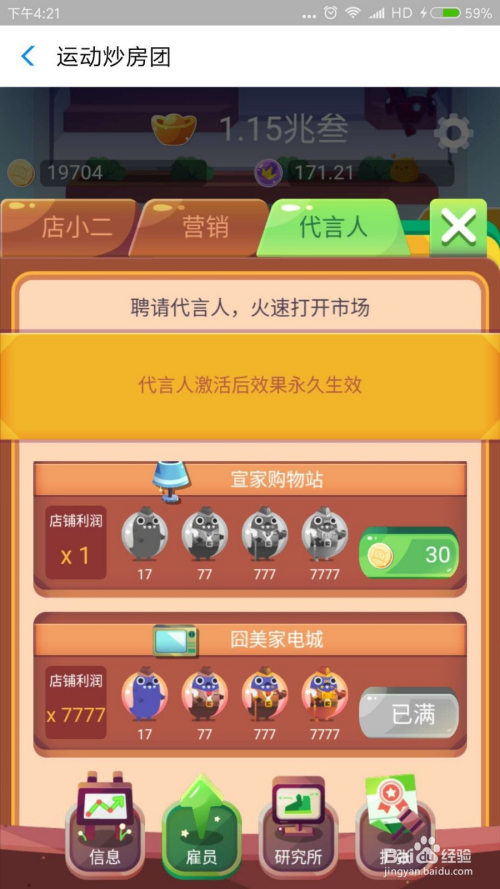 卡币的利用,因为卡币天天最多经由过程走路能获得200卡币,所以必然要用到刀刃上,首先研究所里面的工具不要采办(尤其是前期,我花了快要1000卡币没有发生什么结果,其实是华侈)。卡币本家儿要用来采办代言人,这个是永远有用,性价比很是高,在采办的时辰先后挨次不克不及错,要先采办最下面的囧美家电城的代言人,买齐备今后再一个一个往上买,挨次不要错,否则起头卡币等于是华侈。