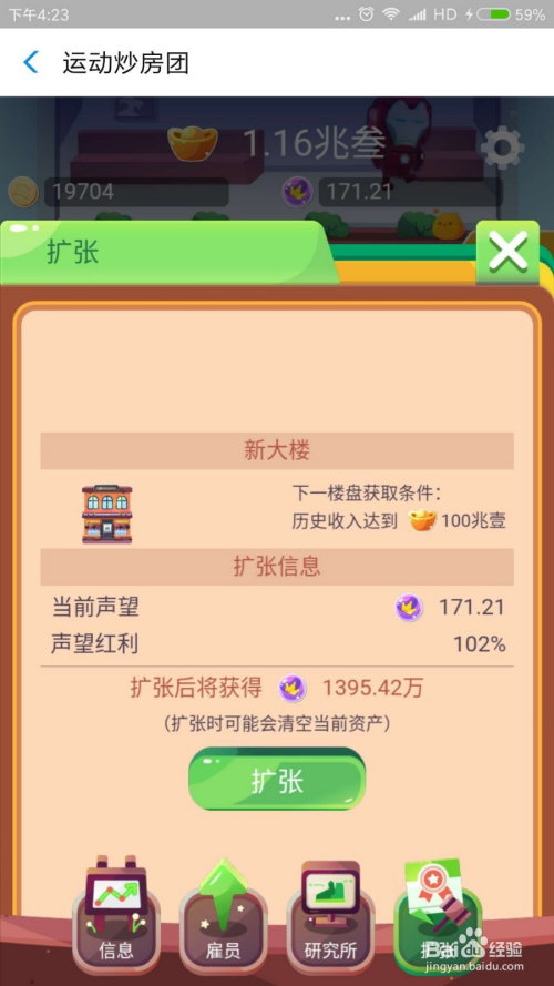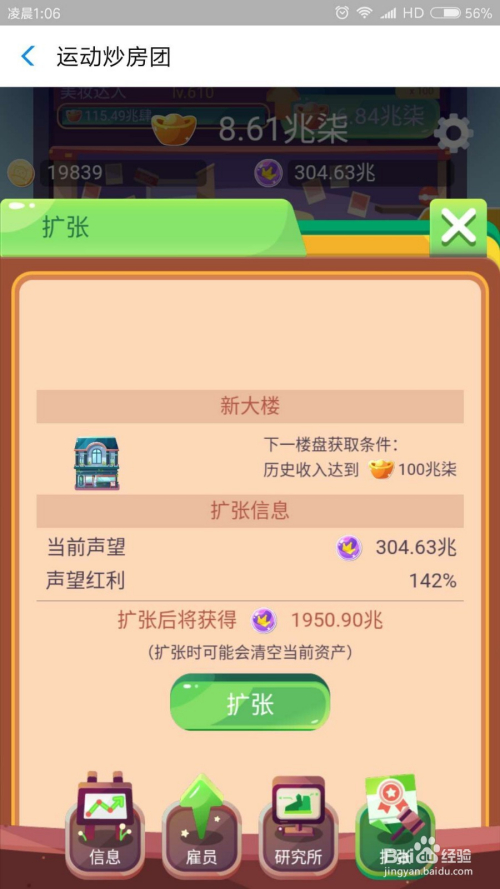 等第一波都进级到100级,再点击扩张,因为扩张可以增添皇冠,用来在营销里面消费,可以削减进级衡宇的费用。不要太早扩张,还不到100级就扩张,获得的皇冠太少,晦气于扩张后的成长。
