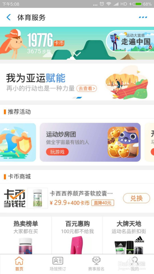 打开付出宝,搜刮体育办事,点击进入后如图,最上方是走路领取卡币,每100步领取一个,天天最高领取200个卡币。中心的保举活动中,就有“活动炒房团”这个游戏,点击进入即可。
