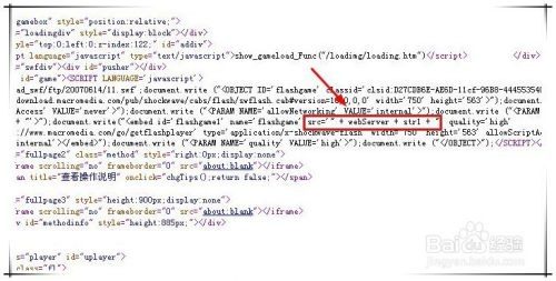 在源代码页面,找到如下图所示代码,可以得知该flash游戏的地址由两个字符串变量webServer 和str1构成。