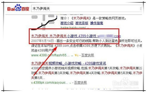 打开百度首页,搜刮关头字“木乃伊闯关”,在搜刮成果中选中如下图所示链接打开。