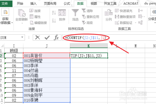 ②我们按住鼠标拖动到其他列,然后再在后面的K2列输入公式“=COUNTIF(J2:J&11,J2”(意思就是查找J2到J11列的数据),同样将此格局填充到其他列,然后K列中年夜于1的值就是含有反复项的(数字2代表有两个反复项),我们手动想起删除即可;