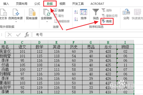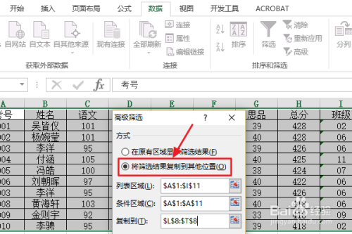 ①依旧选中整个表格,然后点击“数据”-“高级”,如图;然后在高级筛选对话框勾选“将筛选成果复制到其他位置”,如许便于我们做对比