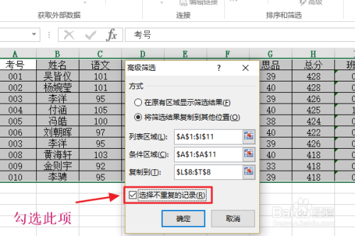 ②然背工动选择列表区域、前提区域以及复制到,前两项都是整个表格区域即可,复制到我们选择一个空白区域,最后务必勾选下方的“选择不反复的记实”,然后新旧两个表格就生当作了,新的表格已经将反复项去失落了;