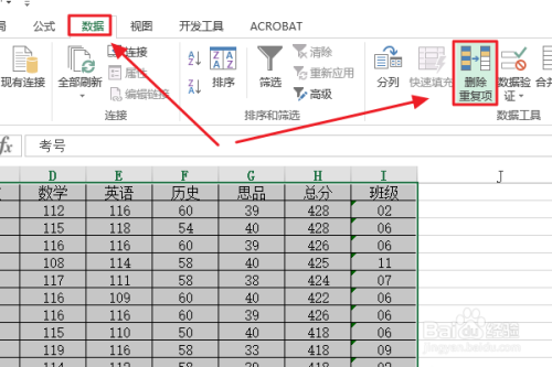 ①首先选中整个我们想要排查的表格,然后依次点击“数据”-“删除反复项”,如图所示...