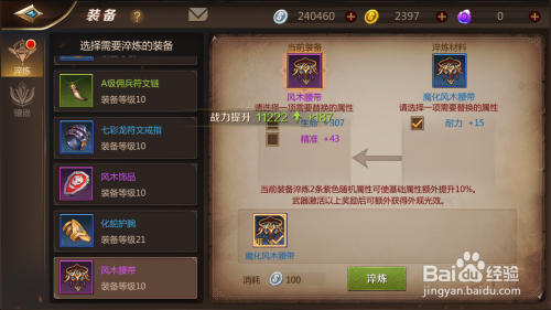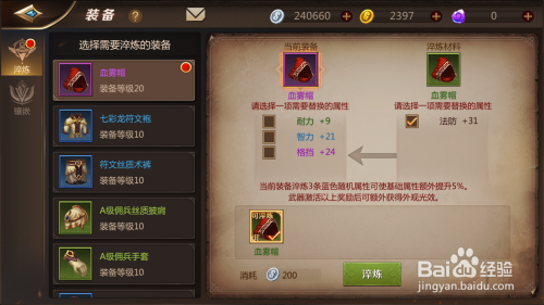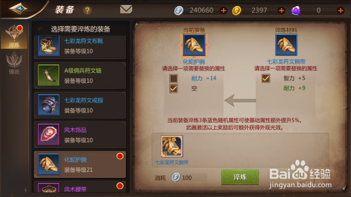 在淬炼装备的时辰,现有装备会有良多的属性,也许就有1个,可是却有空白的空间,这里就可以直接将别的装备中的属性添加到空白属性区域。