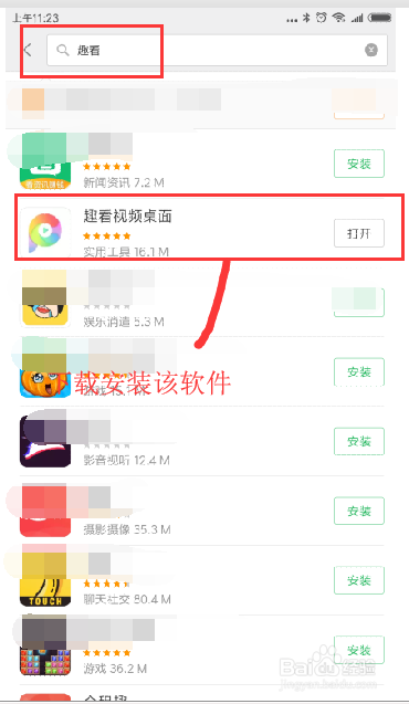 然后打开我们手机自带的应用商城或者是你本身下载的手机应用商城都可以,在应用商城的搜搜框中输入关头字“趣看”,在呈现的手机软件中找到“趣看视频桌面”这个软件,单击下载进行安装。