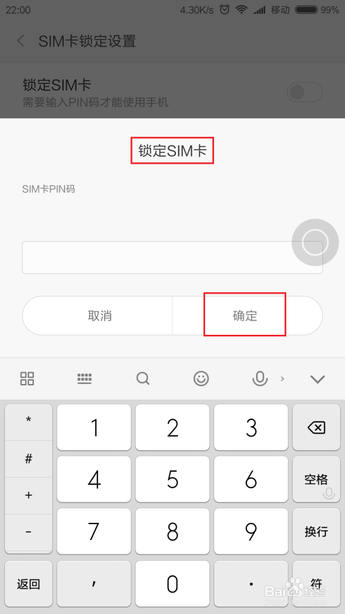 接下来,我们可以看到SIM卡锁定模式处于封闭状况,我们点击此中的锁定开关,然后即可开启SIM卡锁定。