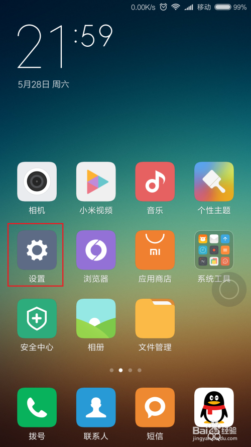 首先,请大师打开MIUI桌面上的“设置”菜单App图标,点击之后即可打开MIUI系统的系统设置应用。