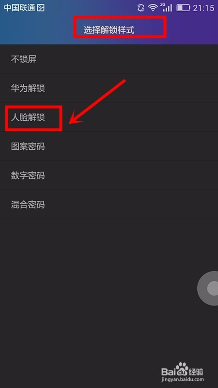 接着,我们就可看到选择解锁样式页面,从页面中选择人脸解锁选项;