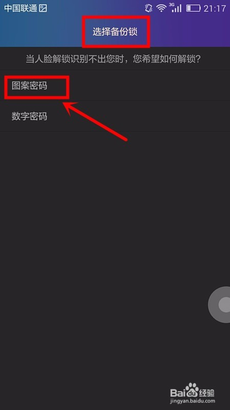 此时,我们就会在新的页面中看到提醒选择备份锁,以图案密码为例,我们点击选择该选项;
