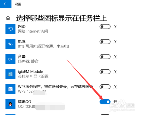 点击右侧的开关,将其打开。打开后,可以在右侧使命栏图标处显示QQ图标啦。