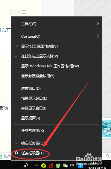 接着鼠标右键点击使命栏的空白处,选择右键菜单中最下面的使命栏设置选项,如下图所示。