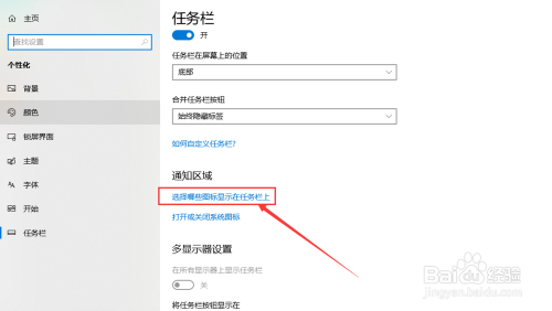 然后打开设置中的使命栏设置页面,将页面往下翻,找到并点击里面的【选择哪些图标显示在使命栏上】,如下图。