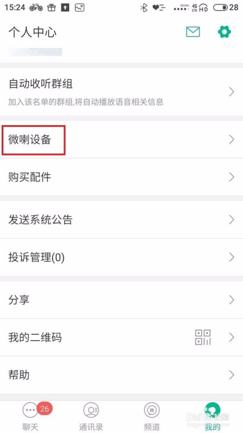 第六步:若是你配有微喇的硬件产物,还可以点击APP右下角“我的”,点击“微喇设备”,在里面绑定或者设置微喇硬件,享受加倍便利、高声或者私密的对讲。