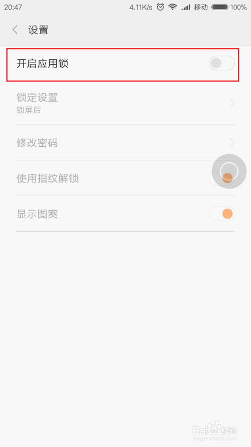 接下来,在打开的设置页面中,我们点击页面右上角的开关按钮,点击之后即可打开应用锁功能。