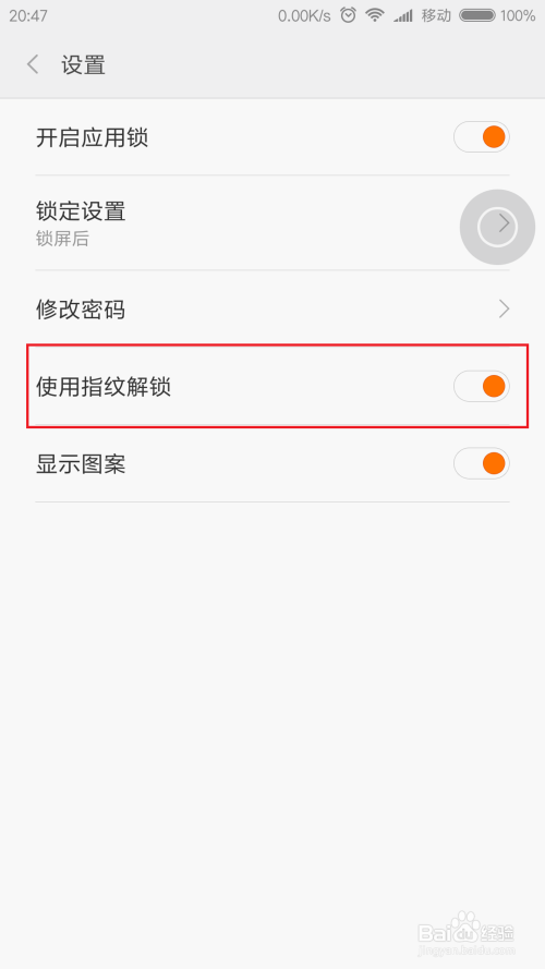 打开应用锁功能之后,我们点击页面下方的“指纹解锁”按钮开关,默认该功能是处于开启状况的,可是为了避免bug导致该功能没有主动开启,但愿大师好好查抄一下。