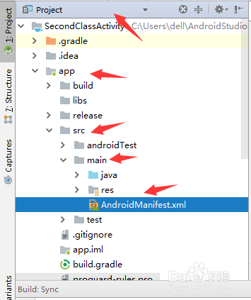 第二种是鄙人拉列表中选择“Project”,然后在文件列表中选择"当前工程名"-"app"-”src“-”main“-"AndroidManifest.xml",双击以打开它