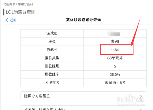 点击(点击查询)后,发现弹出本身查询的游戏ID的英雄联盟埋没分,完当作操作。