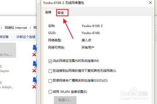 此对话框的中心位置有一项“无线属性”,我们点击它今后可以看到本身无线网的收集属性,我们切换至“平安”;