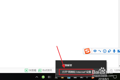 首先,我们在电脑的右下角找到今朝正在毗连的WiFi名称,然后点击鼠标右键,选择弹出的“打开收集和Internet设置”,如下图所示...