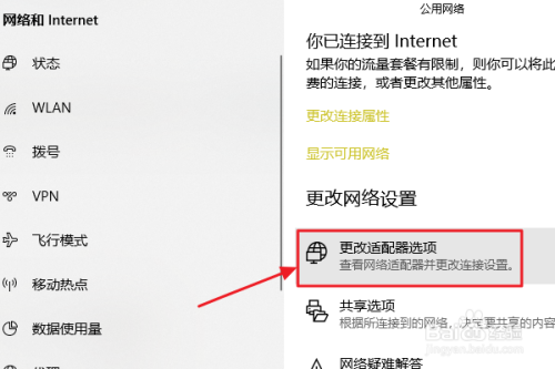 接着在跳转到的收集和Internet设置对话框,我们点击“更改适配器选项”,然后在收集毗连列表中找到本身的阿谁WiFi名称;
