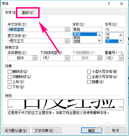 选择字体后,弹出字体的设置窗口,在窗口的选项卡中点击选择【高级】。
