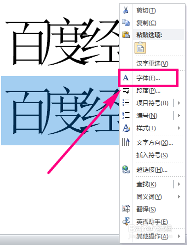 点击右键后会弹出一个菜单,在菜单列表中选择【字体】,如图所示。