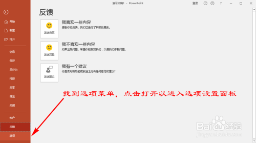 在文件菜单里,我们找到此中的“选项”子菜单,点击并打开进入到PPT选项设置面板。
