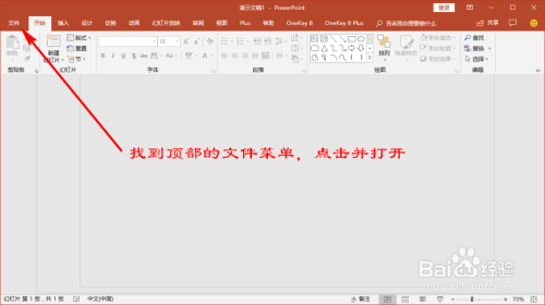 打开PPT,在顶部的菜单栏中,找到“文件”菜单,点击文件菜单,打开其设置选项面板。