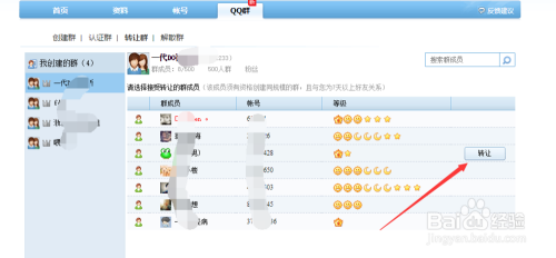 最后,进入到我的QQ中间页面,可以看到本身建立的群环境,鼠标移动到右侧群当作员上,右侧会显示让渡按钮。