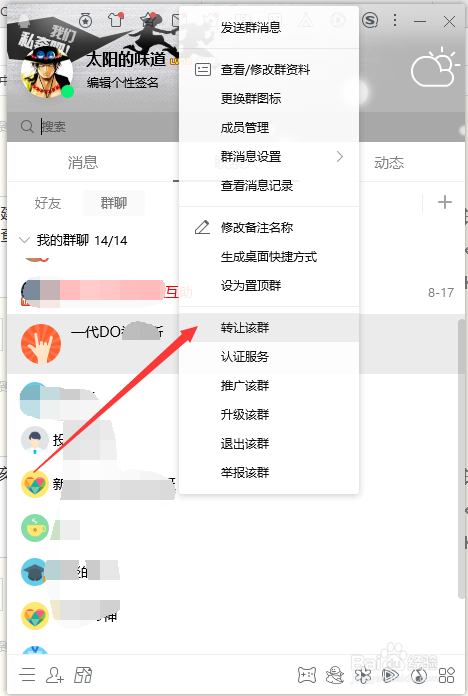 在QQ面板中选中该群后,鼠标右键群,弹出右键菜单,选择此中的让渡该群选项,见下图。