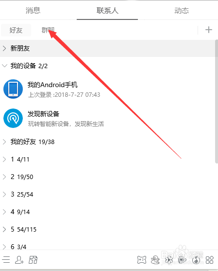 接着,在联系人中,包罗了老友和群聊两个分组,默认进入的是老友列表中,点击上方的群聊按钮。