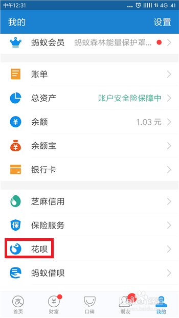 点击打开我的界面后,在界面中找到【花呗】功能并点击打开。
