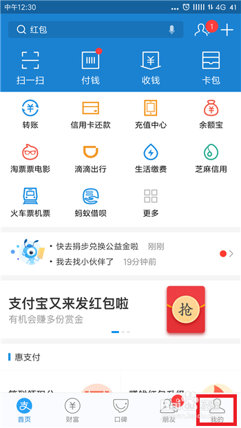 打开付出宝并登岸账号,在首页中点击打开右下角的【我的】选项。