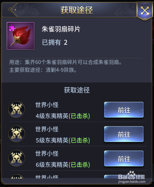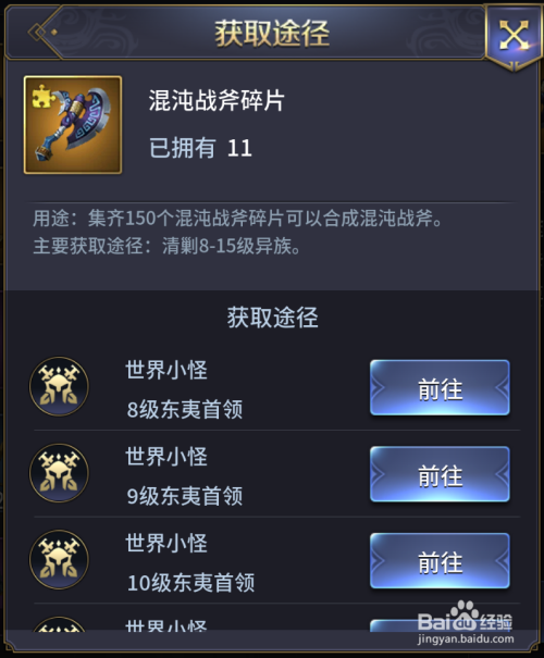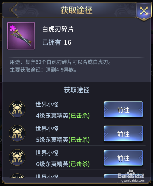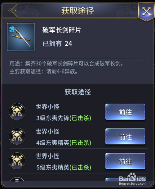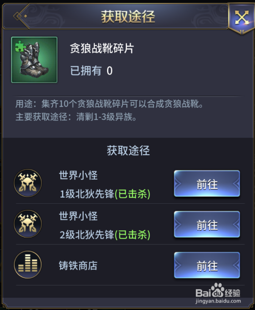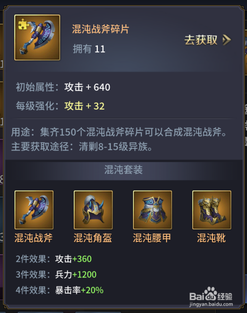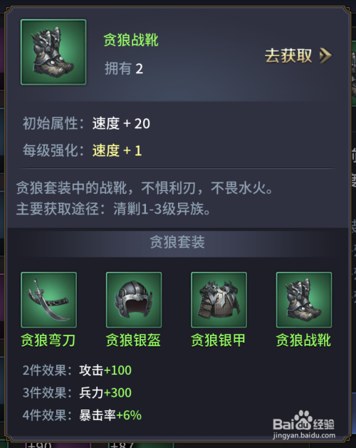 获取的体例是击杀1-3级的外族,拥有2件可晋升进犯100点,3件可提高带兵300,4件晋升6%的暴击。